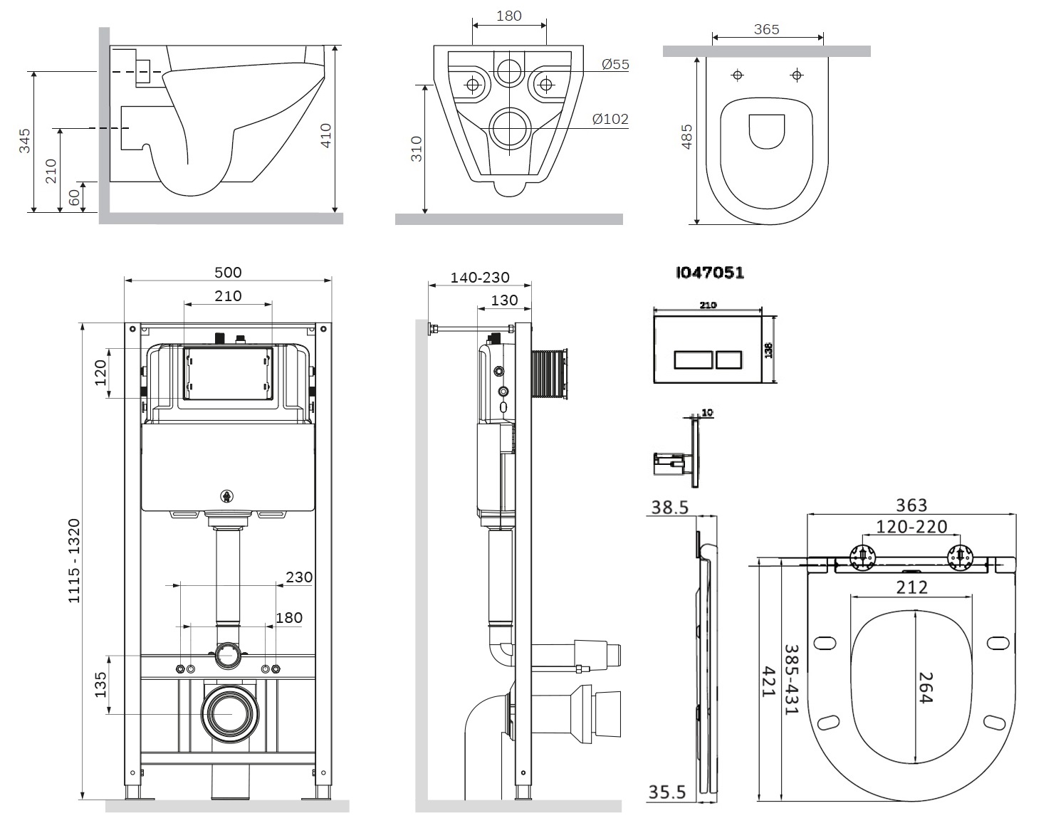 Полностью готовый к установке комплект: система инсталляции с клавишей подвесной унитаз с сиденьем. Неразборная рама из стального профиля выдерживает нагрузку до 400 кг. Полностью изолированный бачок с двухрежимной смывной арматурой. Укомплектован механической клавишей в цвете глянцевый хром.